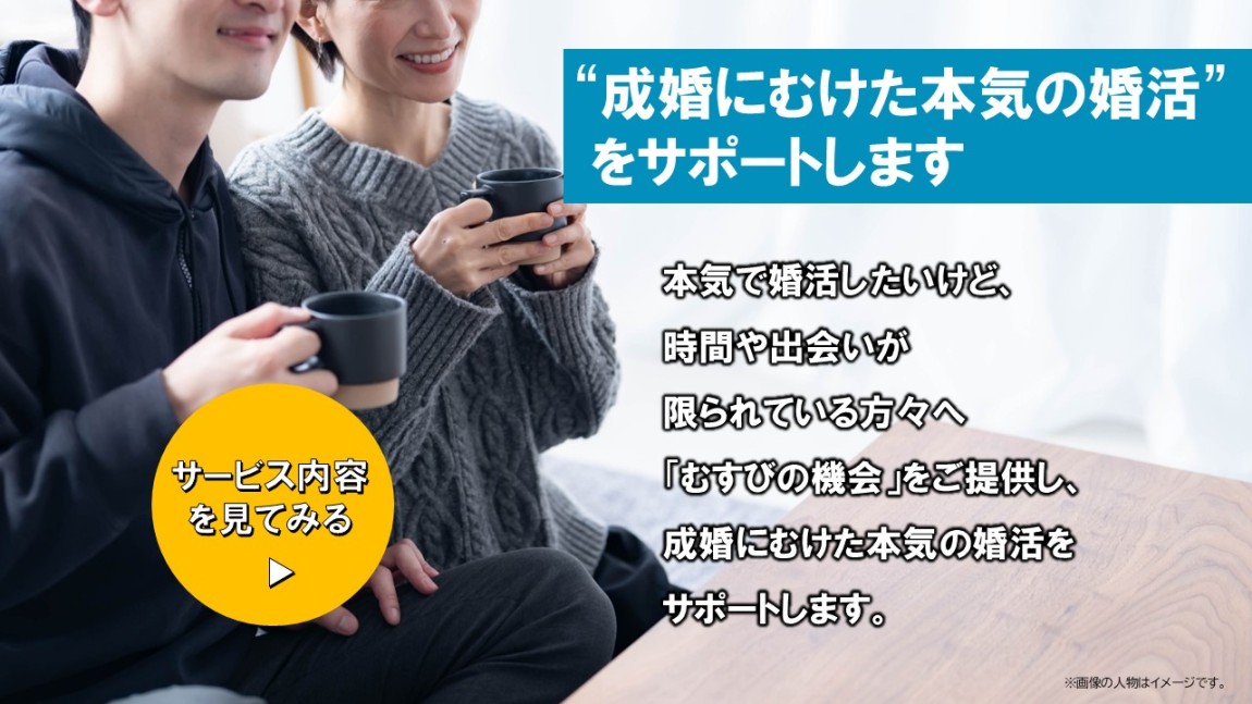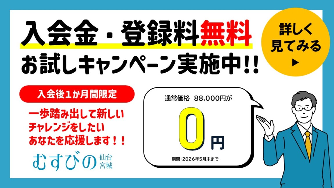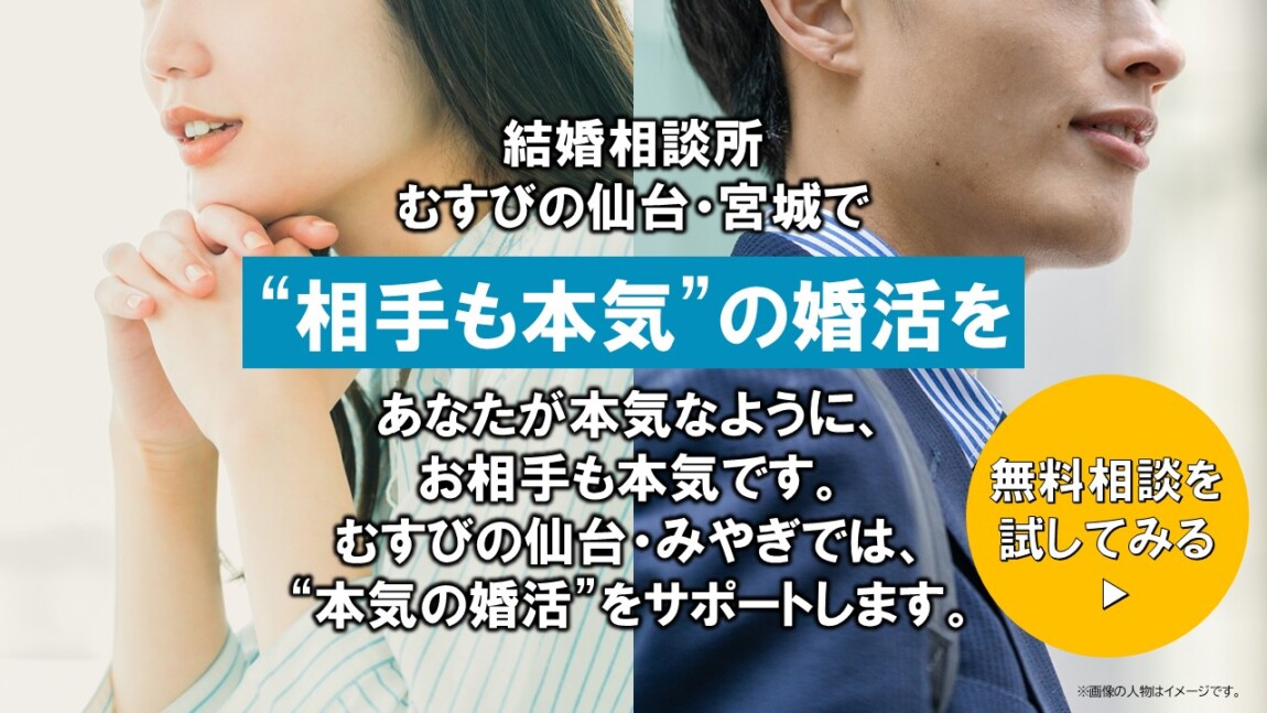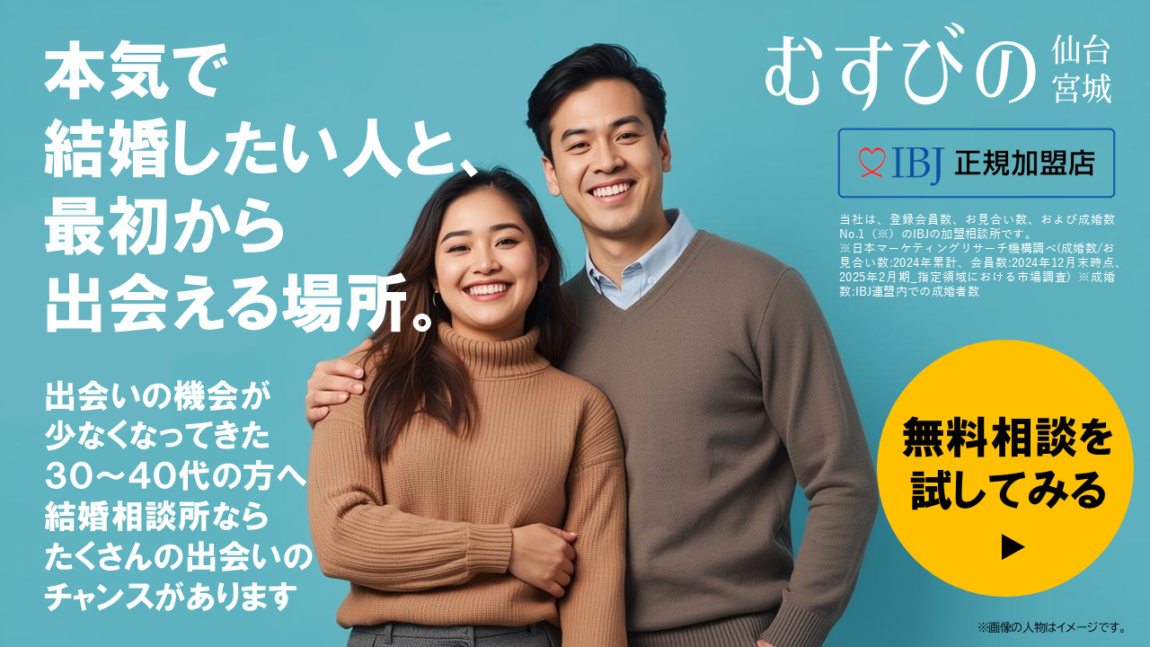 「むすびの仙台・宮城」では 本気で婚活したいけど、 時間や出会いが限られている方々へ 「むすびの機会」をご提供し、 成婚にむけた本気の婚活をサポートします。 会員数10万人以上!(2025年9月現在) むすびの仙台・宮城はIBJ正規加盟店です。