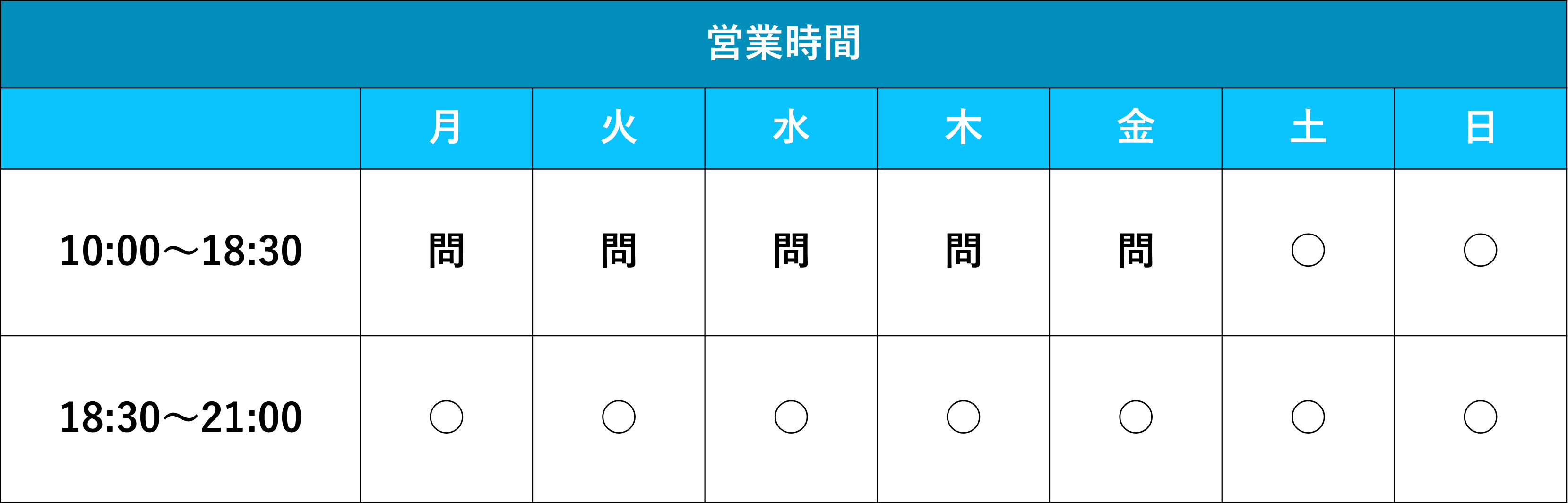 営業日時は下記の表に沿いますが、詳しくはお問い合わせください
