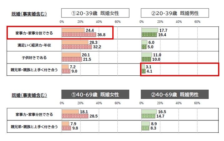 結婚前に相手に求めたこと(理想)と現在相手に求めること(現実)について、実際に結婚後にどんな差があったのか?はたまた無かったのか?男女共同参画局の令和3年度の調査データをもとに【20~39歳】【40~69歳】の既婚男女が感じていることを見ていきましょう。