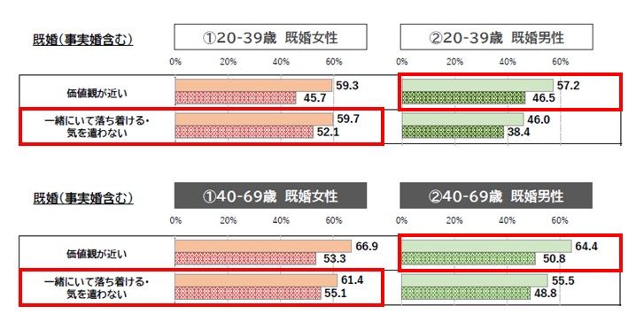 男性は「価値観が近い」で20-39歳男性で46.5%、40-69歳男性で50.8%となっています。