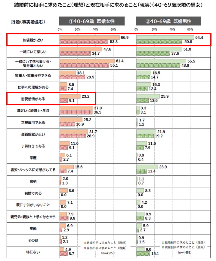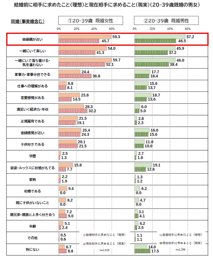 となっており、その差は全体で10~14%程度でした。結婚後には結婚前ほどには自分と相手の価値観の近さを求めなくなる(=価値観の違いを受け入れる・許容する・あきらめる)ことが多くなっているようです。